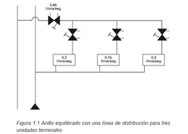 La figura 1.1 muestra un esquema de un anillo equilibrado perteneciente a una instalación de distribución. La instalación estará equilibrada cuando las válvulas de equilibrado hayan sido ajustadas de tal forma que el caudal en las unidades terminales, líneas de distribución y primario sea el especificado en proyecto.