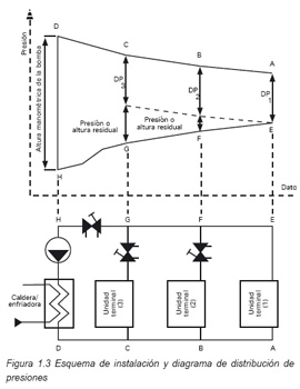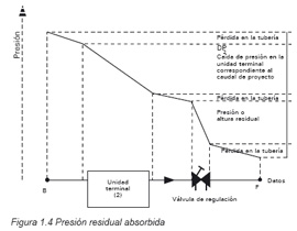La figura 1.4 muestra la distribución de presiones entre los puntos BF. De su examen se desprende que a la hora de ajustar la válvula de regulación se ha de tener en cuenta la pérdida de carga tanto en la unidad terminal como en las tuberías.