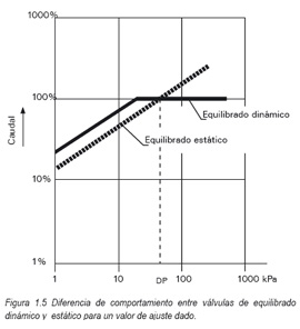 La figura 1.5 ilustra la diferencia de comportamiento entre las válvulas de equilibrado dinámico y estático y que repercusiones tiene el empleo de uno u otro sistema en la variación del caudal en función de la presión diferencial en la instalación.